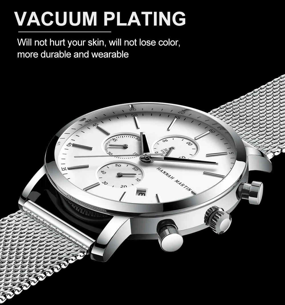 Die Hannah Martin HM-109 Quarzuhr bietet den perfekten Mix aus modernem Design und funktionalen Eigenschaften. Diese hochwertige Uhr ist ideal für modebewusste Männer, die sowohl einen klassischen Stil als auch eine praktische Funktionalität suchen. Mit einem präzisen Quarzwerk, einem Chronographen, einem automatischen Kalender und einer Wasserdichtigkeit von bis zu 3 ATM ist diese Uhr nicht nur stilvoll, sondern auch langlebig und zuverlässig.